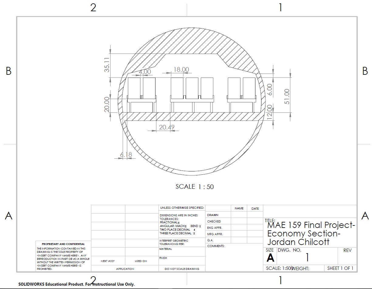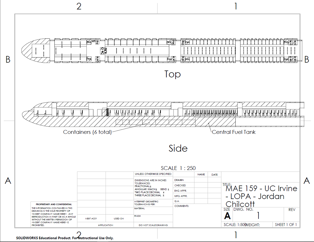 SUMMARY: Designed and modeled a 3-class jet aircraft (1st, business, and coach classes) that can fly internationally 7000 nautical miles and hold 250 passengers with their luggage. All basic equipment was represented minus the electrical system.